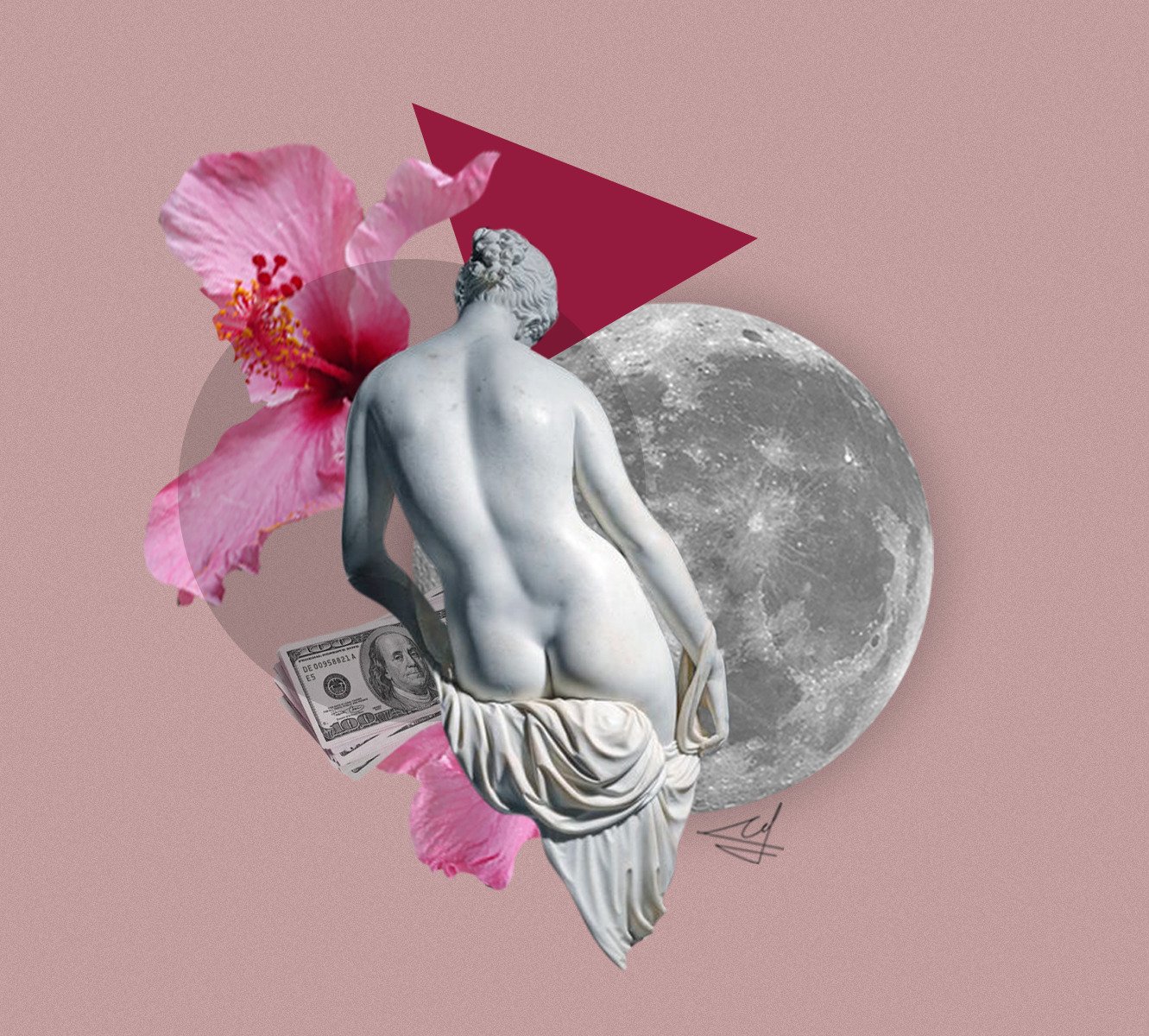 Tu universo visual parece moverse entre el sueño y la geometría: figuras clásicas, cielos rosados, flores que se abren sobre cuerpos y una constante sensación de expansión. Desde dónde nace ese imaginario, qué te atrae de esos símbolos y composiciones casi oníricas/surrealistas?